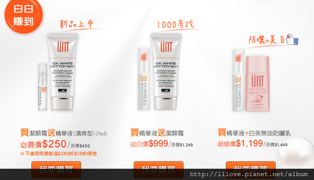 剛好UNT最近有優惠活動來造福小資女孩們呢!各式美白優惠組合: